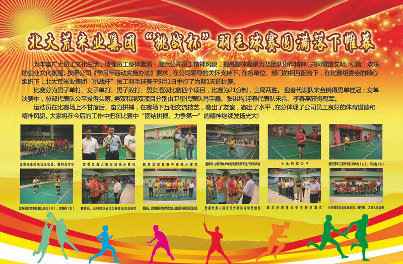 為豐富廣大員工文化生活,增強員工身體素質(zhì),展示公司員工精神風(fēng)貌,提高整體凝聚力及團隊協(xié)作精神,共同營造文明、和諧、歡樂的企業(yè)文化氛圍。經(jīng)研究決定舉辦“挑戰(zhàn)杯”員工羽毛球比賽。在接到公司《黑龍江省北大荒米業(yè)集團有限公司工會委員會關(guān)于舉辦“挑戰(zhàn)杯”員工羽毛球比賽的通知》的時候,熱愛羽毛球運動的我可以用歡呼雀躍來形容自己的心情。