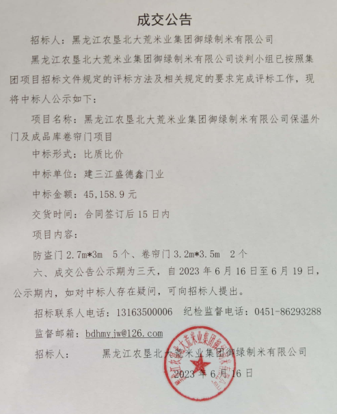 北大荒米業(yè)御綠公司保溫外門(mén)及成品庫(kù)卷簾門(mén)成交公告