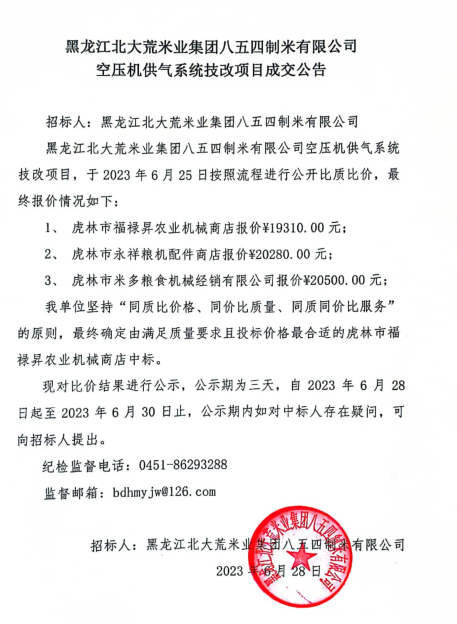 黑龍江省北大荒米業(yè)集團八五四制米有限公司空壓機供氣系統(tǒng)技改項目成交公告
