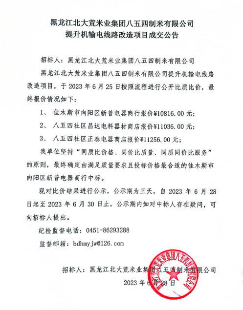 黑龍江省北大荒米業(yè)集團(tuán)有限公司八五四制米有限公司提升機(jī)輸電線路改造項(xiàng)目成交公告