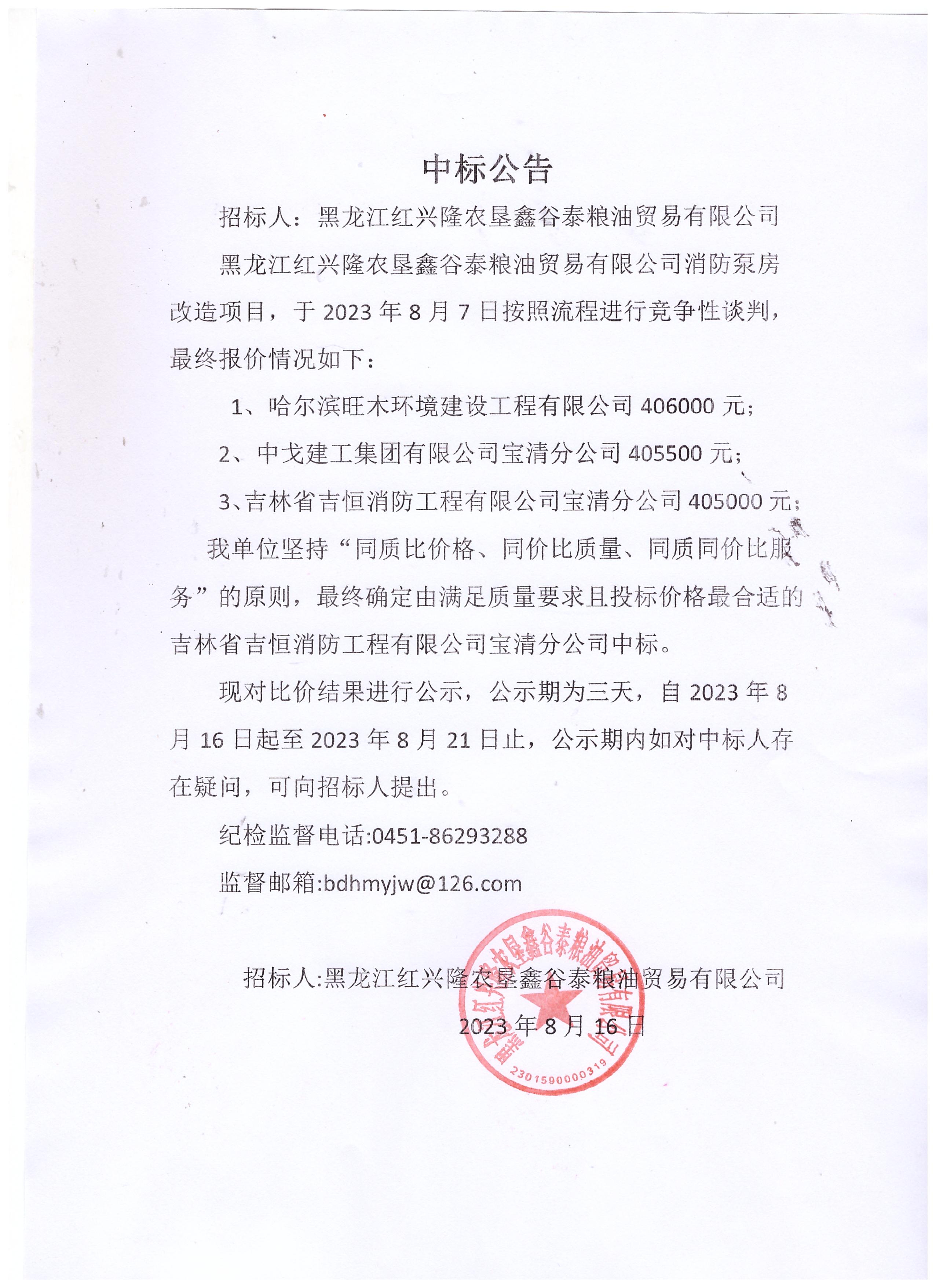 黑龍江紅興隆農(nóng)墾鑫谷泰糧油貿(mào)易有限公司消防泵房改造項目中標公告