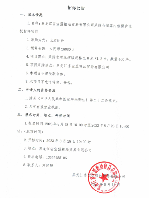 黑龍江省寶盟糧油貿(mào)易有限公司采購(gòu)倉(cāng)儲(chǔ)庫(kù)內(nèi)糧面步道板材項(xiàng)目招標(biāo)公告