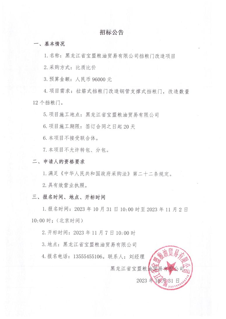 黑龍江省寶盟糧油貿(mào)易有限公司擋糧門改造項(xiàng)目招標(biāo)公告