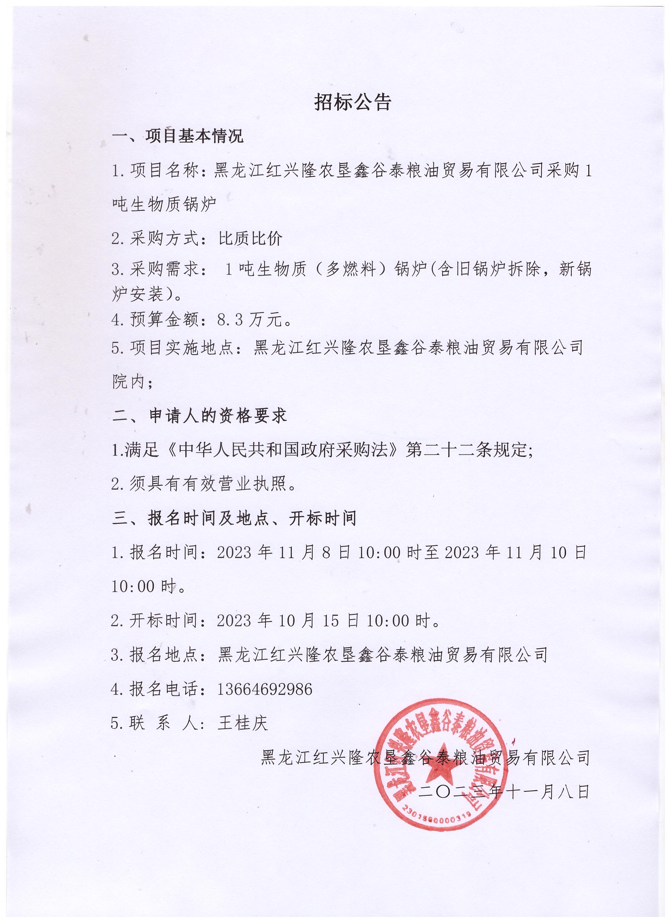 黑龍江紅興隆農墾鑫谷泰糧油貿易有限公司采購1噸生物質鍋爐招標公告