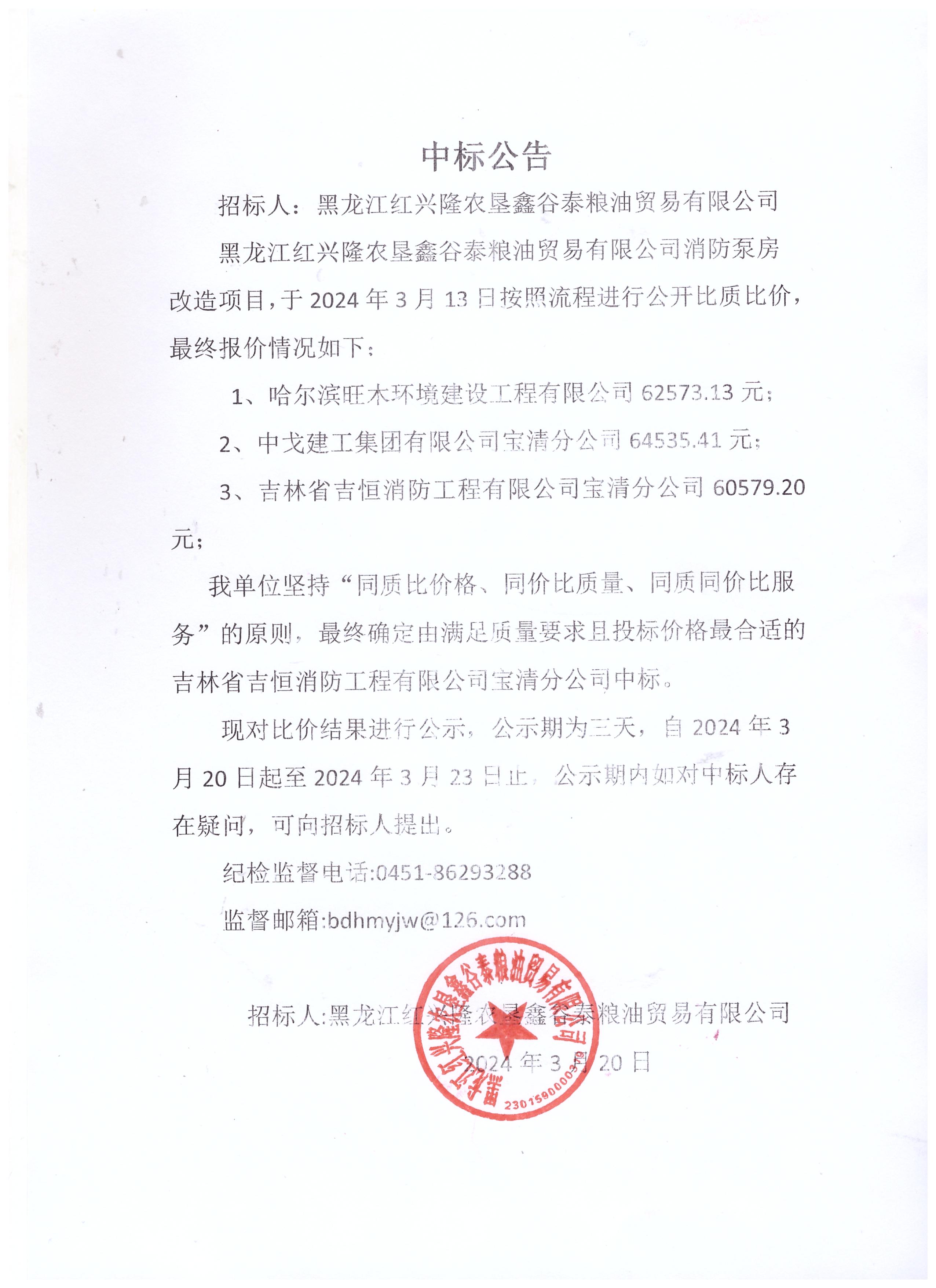 黑龍江紅興隆農(nóng)墾鑫谷泰糧油貿(mào)易有限公司消防泵房改造項(xiàng)目中標(biāo)公告