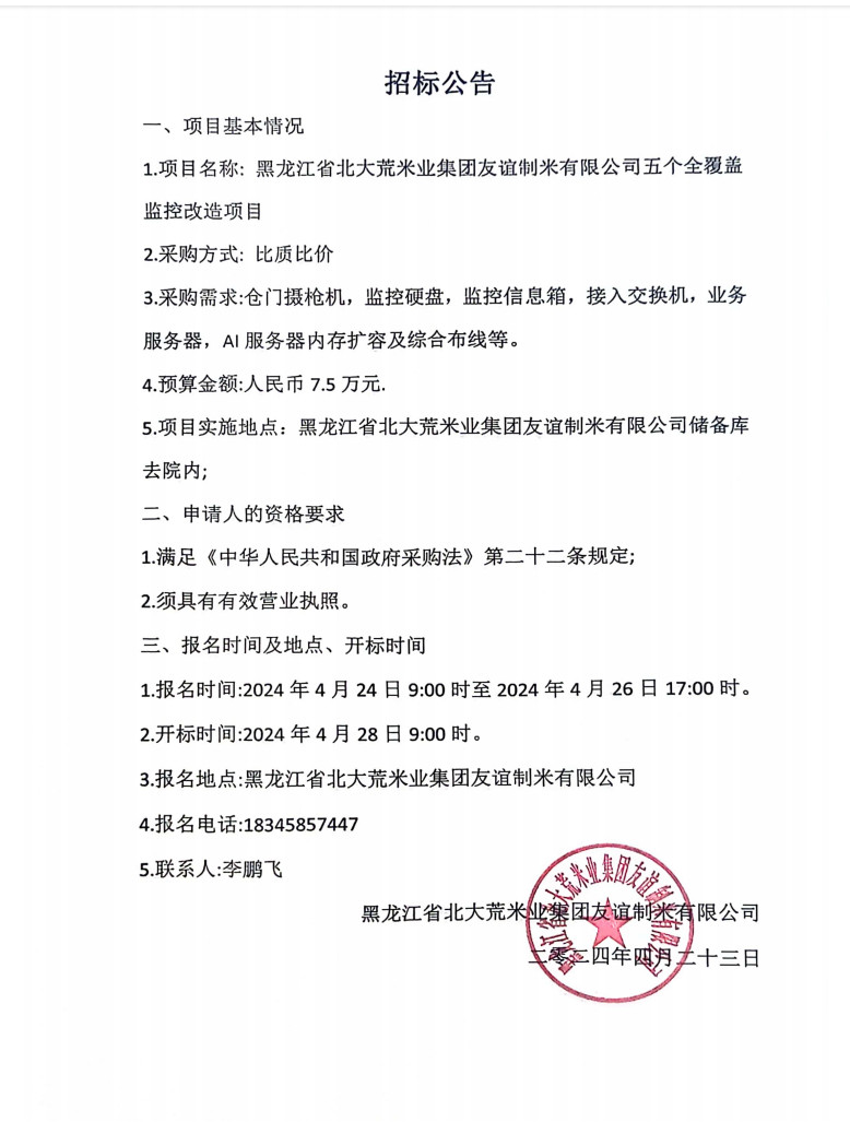 北大荒米業(yè)友誼公司五個全覆蓋監(jiān)控改造項目招標公告
