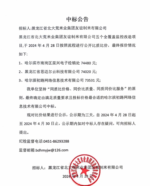 北大荒米業(yè)友誼公司五個全覆蓋監(jiān)控改造項目中標(biāo)公告