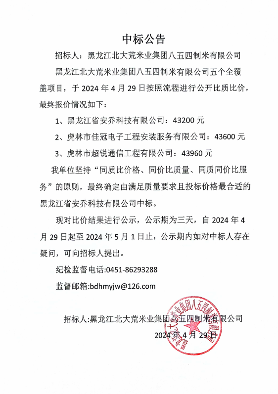 北大荒米業(yè)854制米公司五個覆蓋安裝采購項目中標(biāo)公告