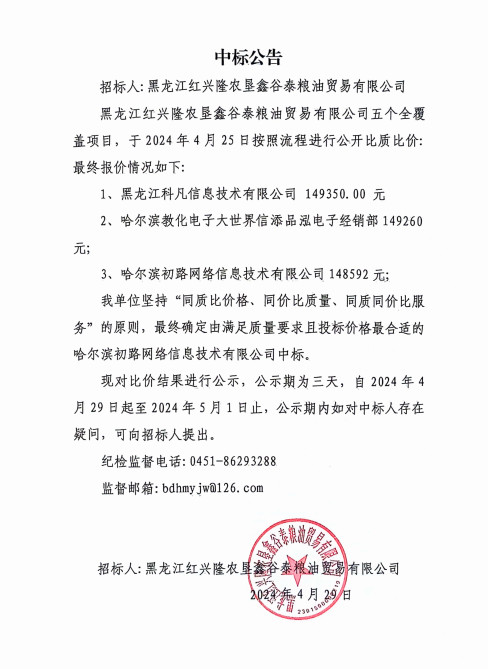 黑龍江紅興隆農(nóng)墾鑫谷泰公司五個(gè)全覆蓋項(xiàng)目中標(biāo)公告