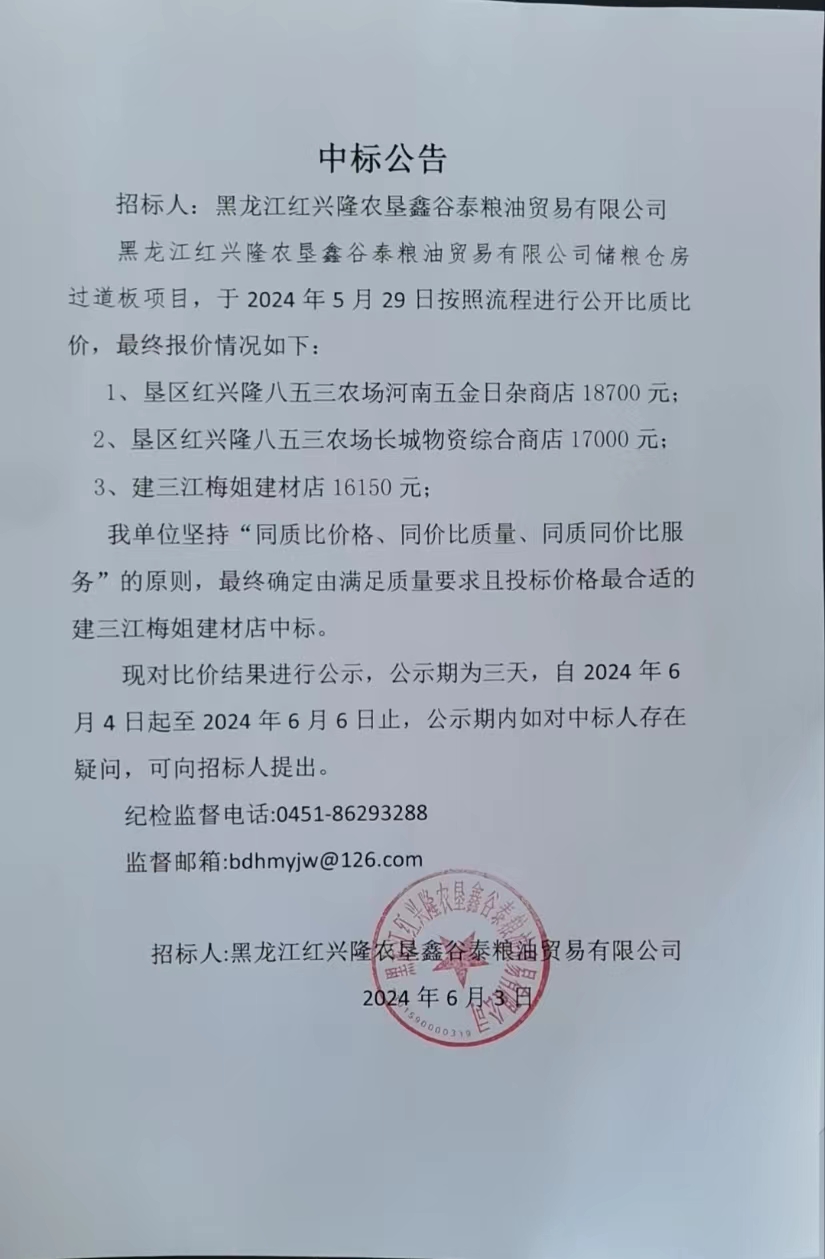 黑龍江紅興隆農(nóng)墾鑫谷泰糧油貿(mào)易有限公司糧儲(chǔ)倉房過道板項(xiàng)目中標(biāo)公告