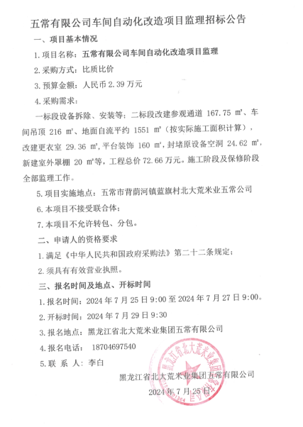 五常有限公司車間自動化改造項目監(jiān)理招標(biāo)公告