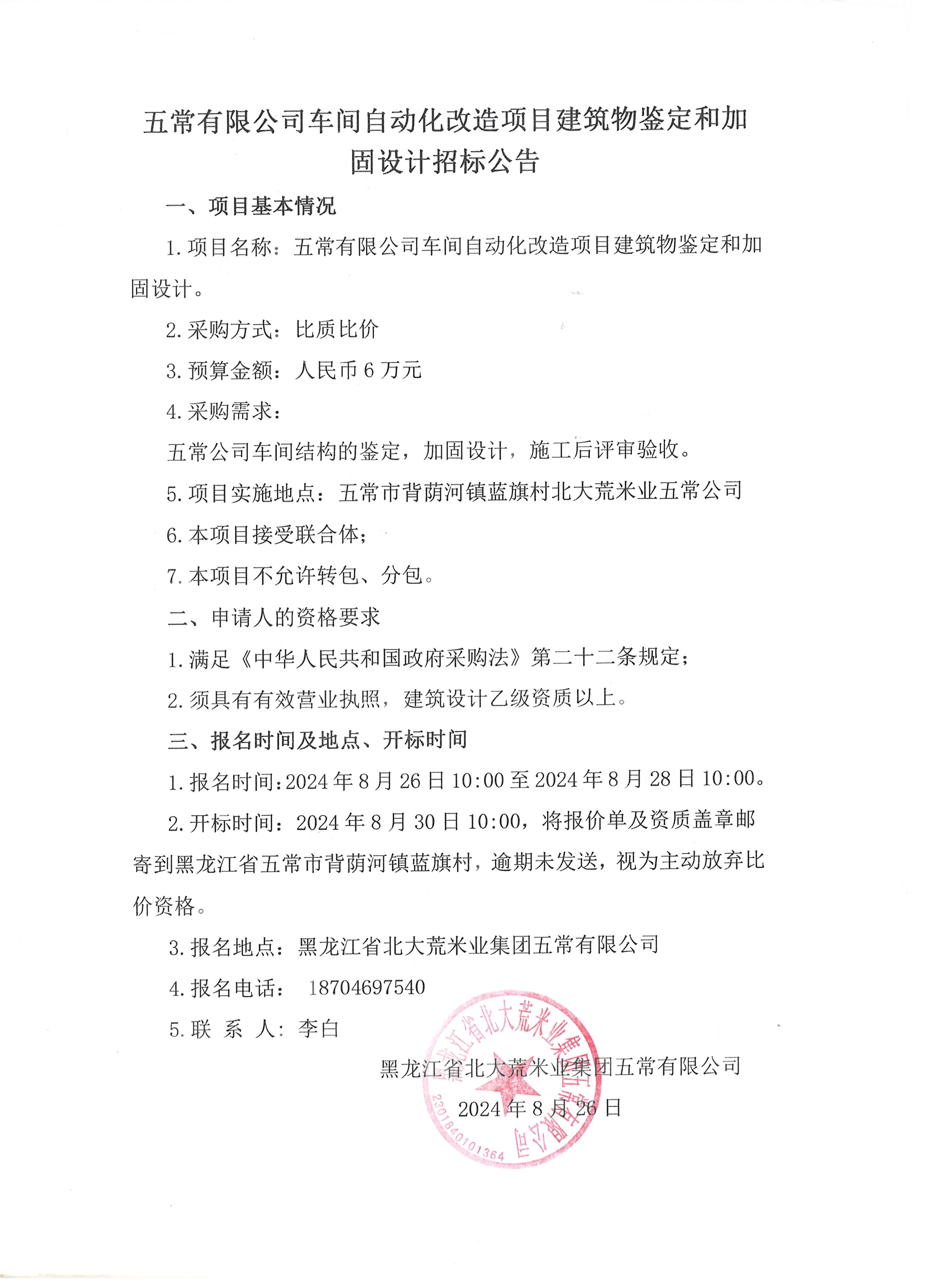 五常有限公司車間自動化改造項目建筑物鑒定和加固設(shè)計招標(biāo)公告