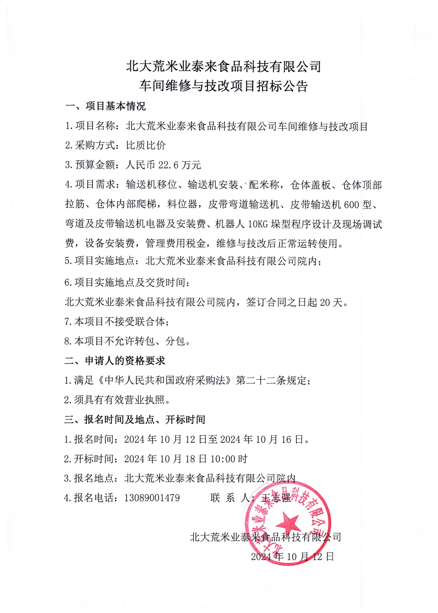 北大荒米業(yè)泰來(lái)食品科技有限公司車間維修與技改項(xiàng)目招標(biāo)公告