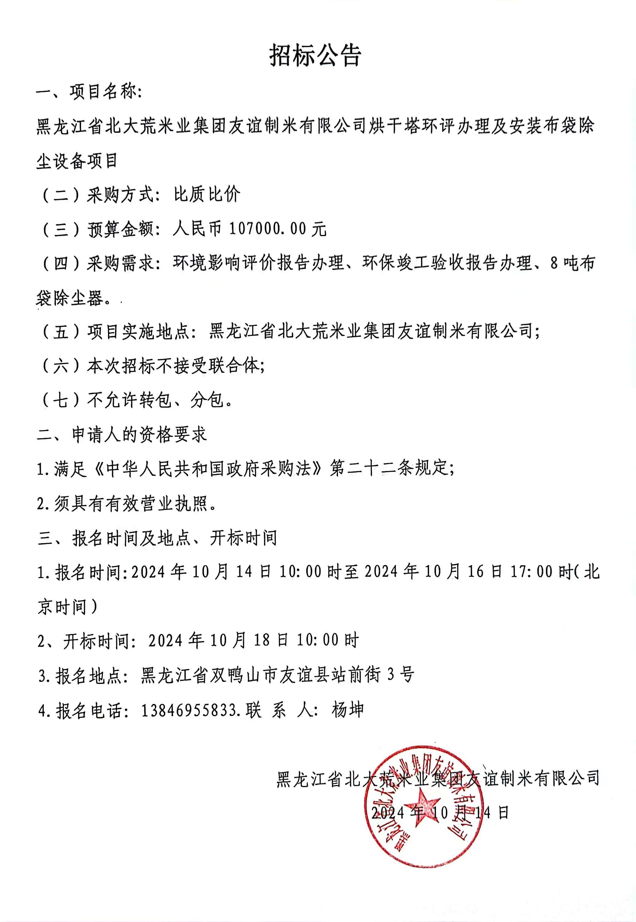 黑龍江省北大荒米業(yè)集團(tuán)友誼制米有限公司烘干塔環(huán)評(píng)辦理及安裝布袋除塵設(shè)備項(xiàng)目招標(biāo)公告