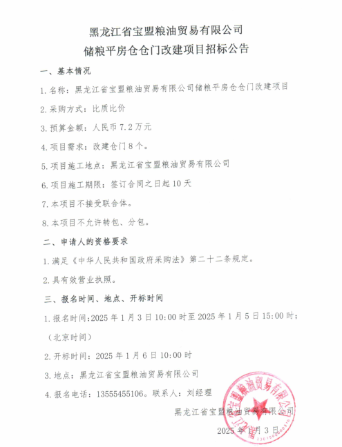 黑龍江省寶盟糧油貿易有限公司儲糧平房倉倉門改建項目招標公告