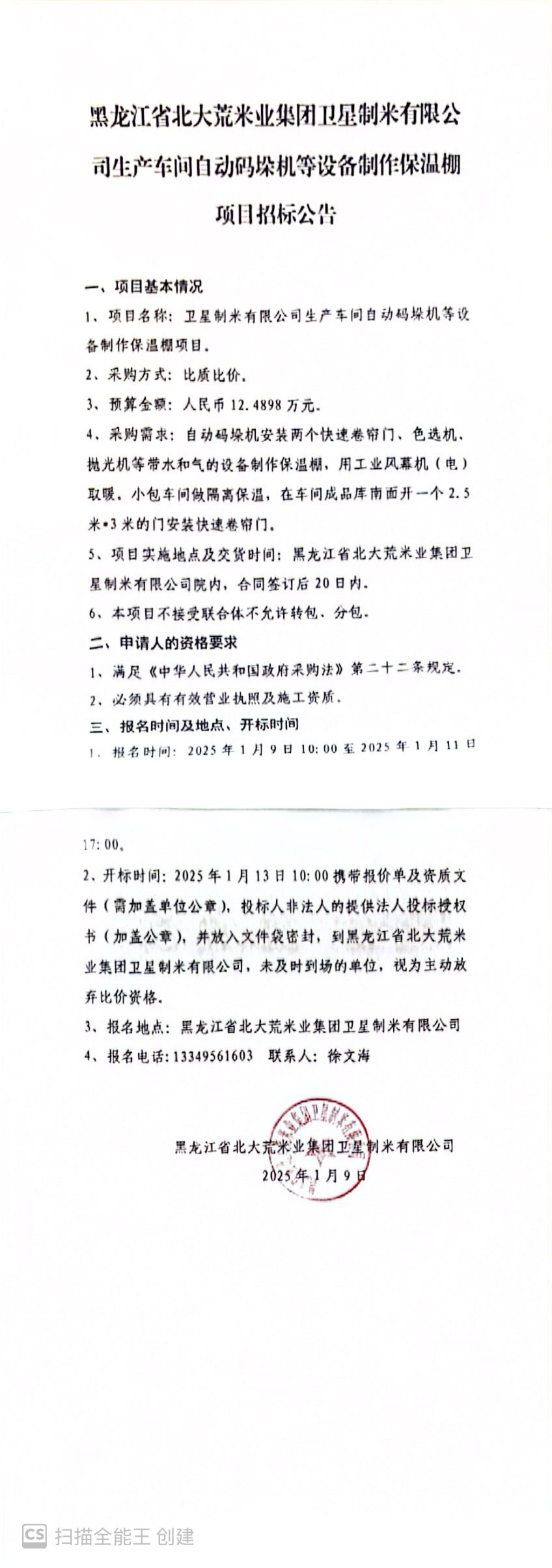 黑龍江省北大荒米業(yè)集團(tuán)衛(wèi)星制米有限公司生產(chǎn)車間自動(dòng)碼垛機(jī)等設(shè)備制作保溫棚項(xiàng)目招標(biāo)公告