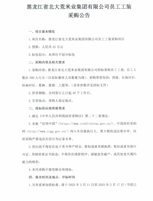 黑龍江省北大荒米業(yè)集團(tuán)有限公司員工工裝采購(gòu)項(xiàng)目招標(biāo)公告