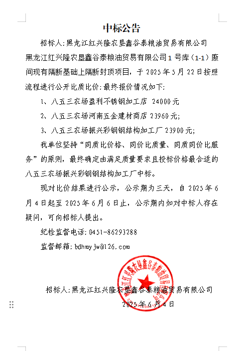 鑫谷泰公司隔斷封項(xiàng)項(xiàng)目中標(biāo)公告