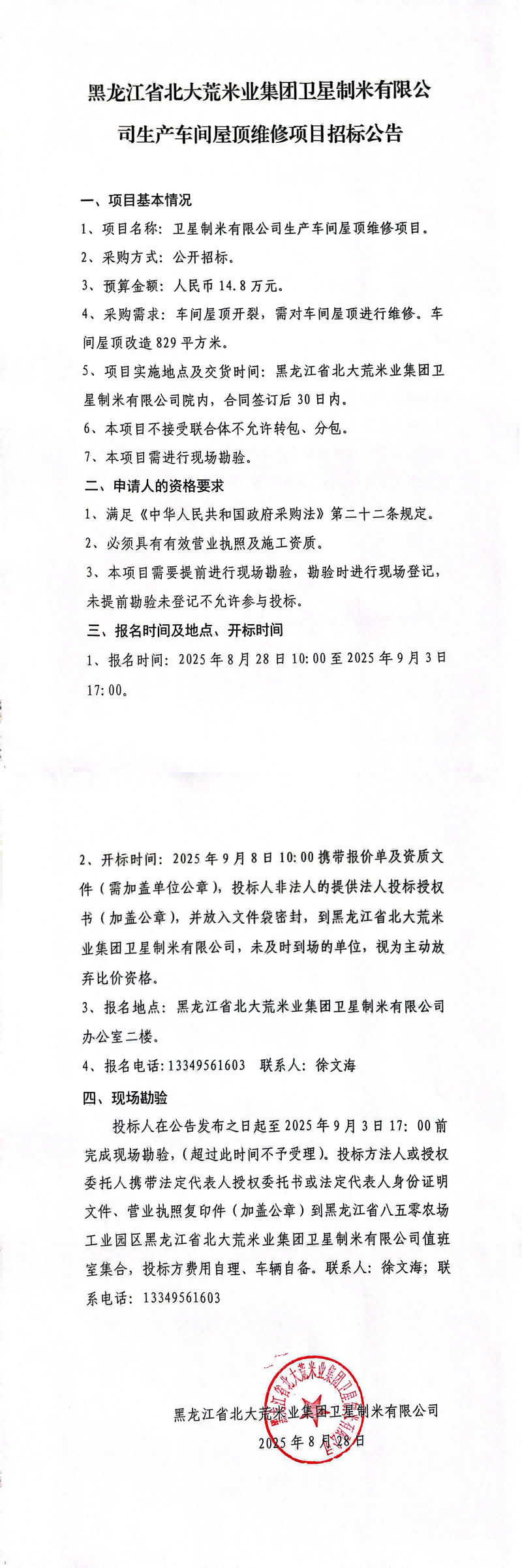 衛(wèi)星制米有限公司生產車間屋頂維修項目招標