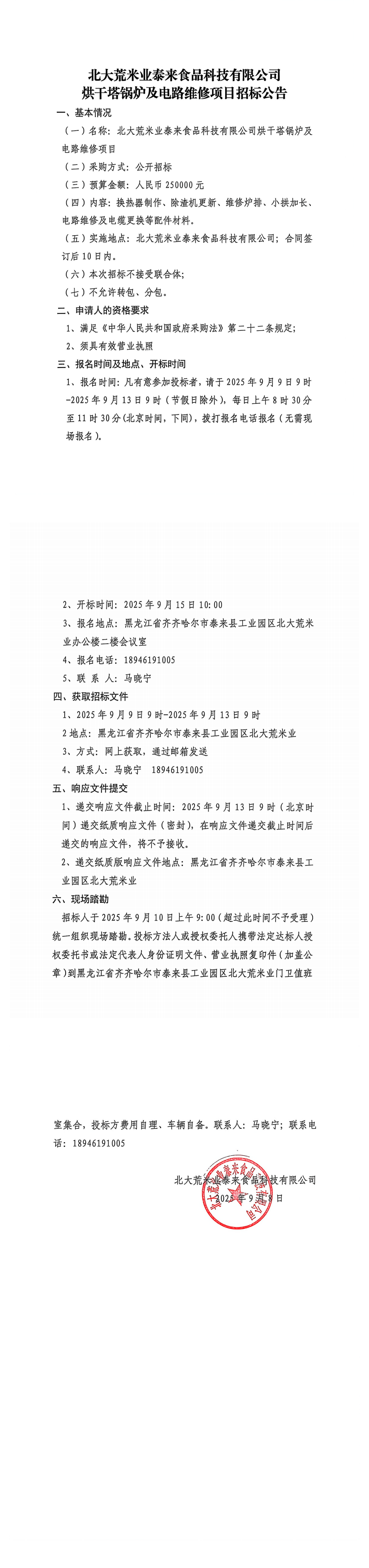 北大荒米業(yè)泰來食品科技有限公司烘干塔鍋爐及電路維修項(xiàng)目
