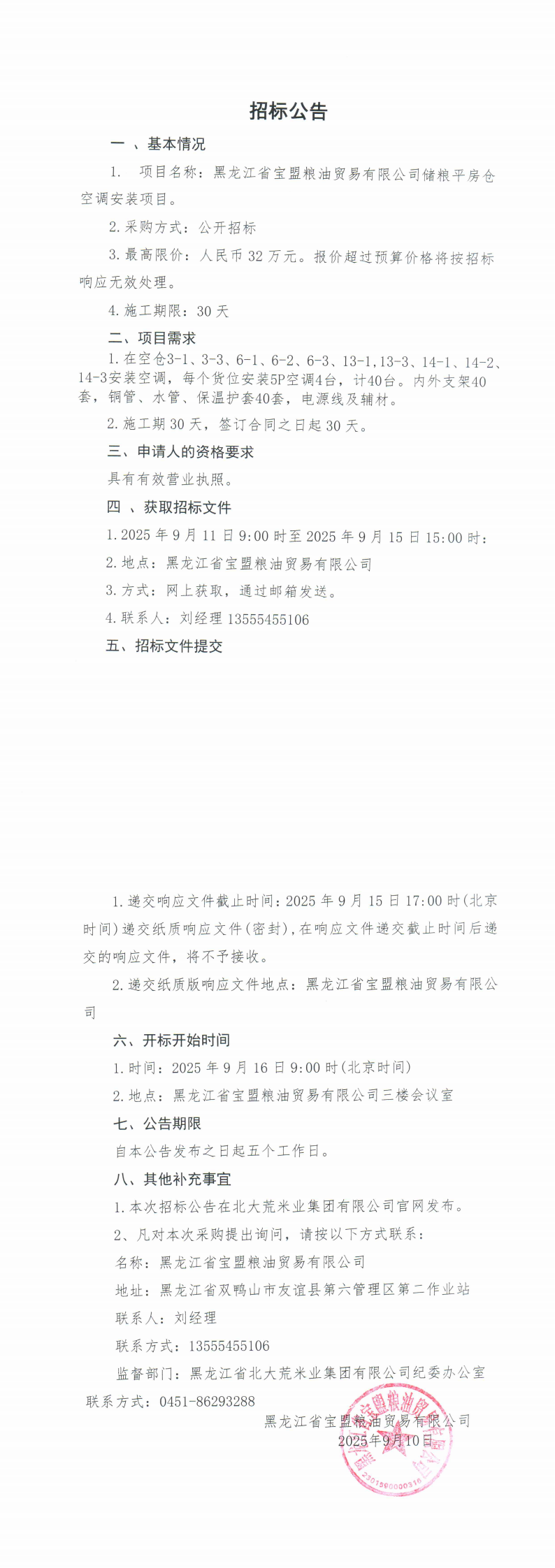 寶盟糧油貿(mào)易有限公司儲(chǔ)糧平房倉(cāng) 空調(diào)安裝項(xiàng)目招標(biāo)公告