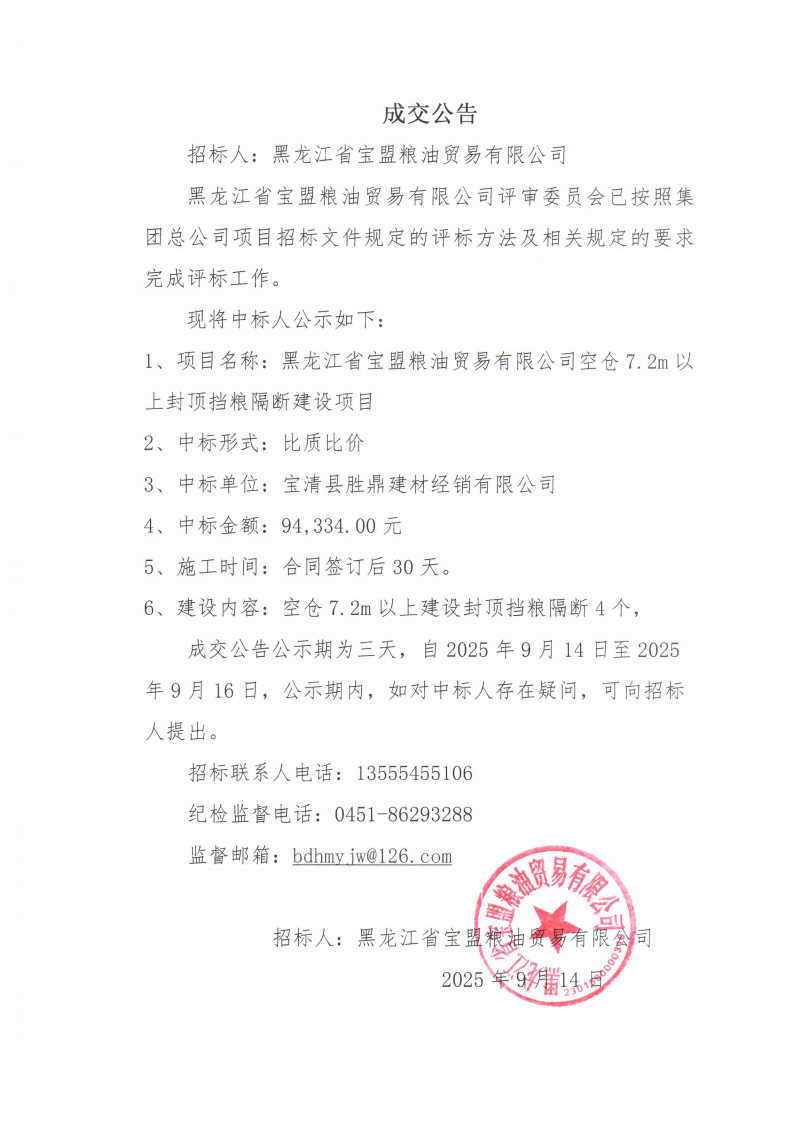 寶盟糧油貿(mào)易有限公司空倉(cāng)7.2m以上封頂擋糧隔斷建設(shè)項(xiàng)目中標(biāo)公告