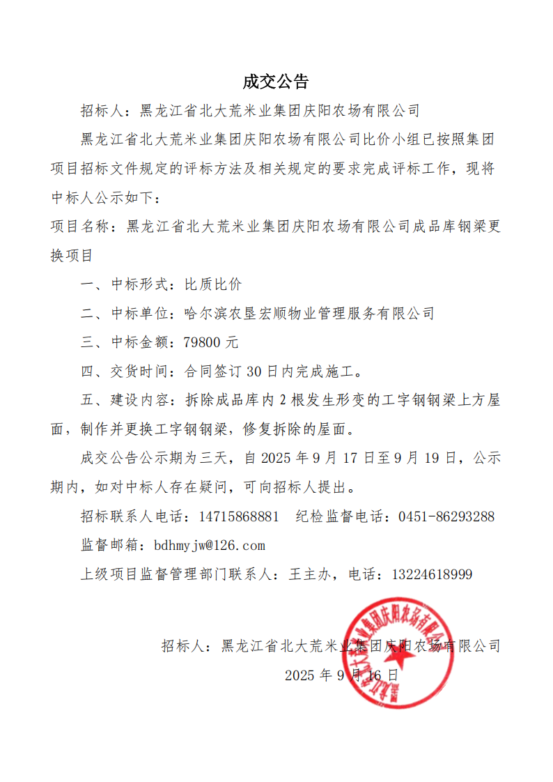 北大荒米業(yè)集團慶陽農場有限公司成品庫鋼梁更換項目中標公告