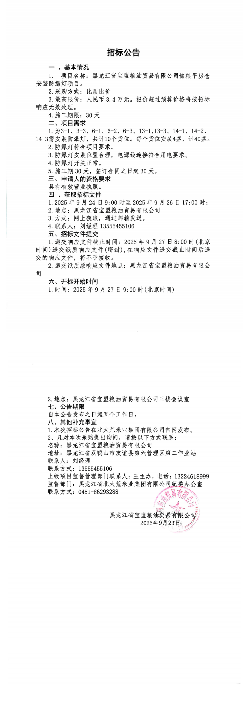 黑龍江省寶盟糧油貿(mào)易有限公司儲糧平房倉安裝防爆燈項目招標(biāo)公告