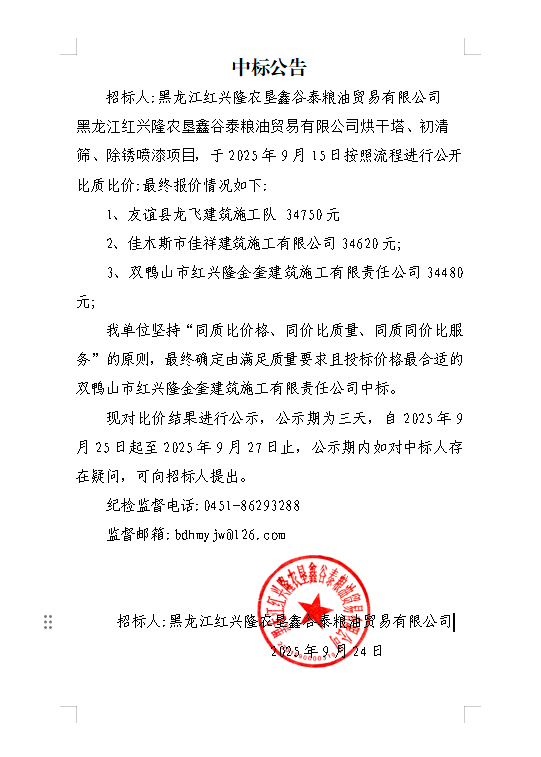 紅興隆農(nóng)墾鑫谷泰糧油貿(mào)易有限公司烘干塔、初清篩、除銹噴漆項目成交公告