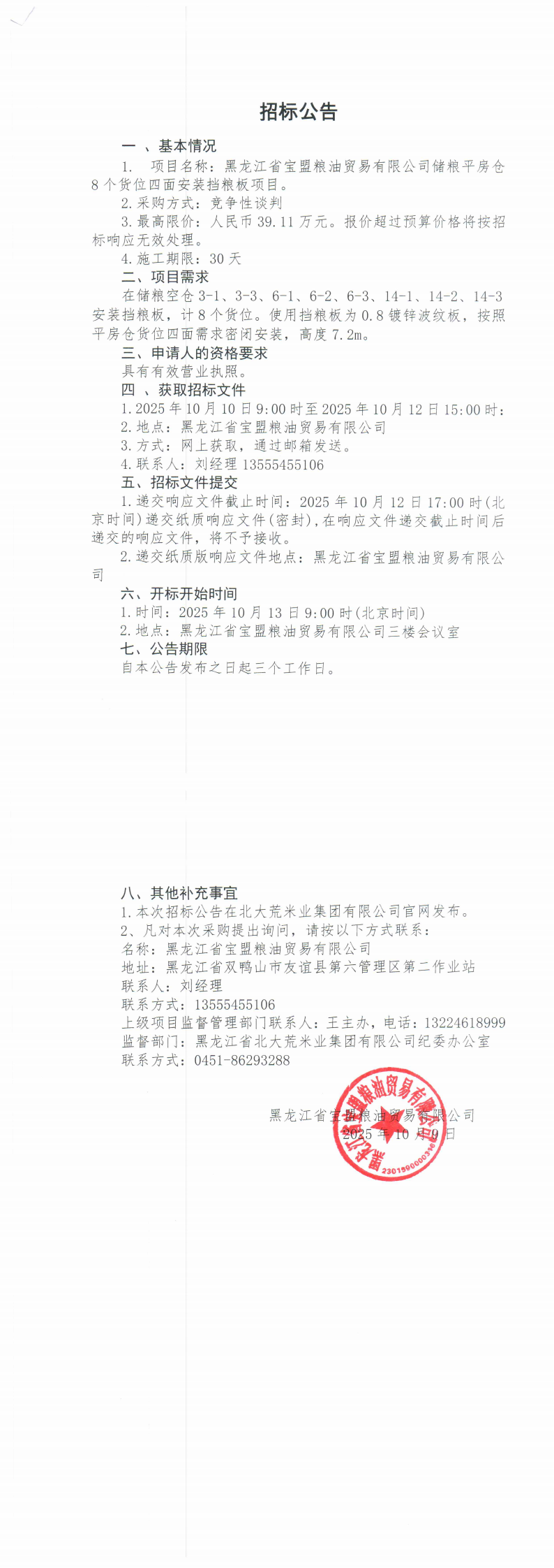 黑龍江省寶盟糧油貿(mào)易有限公司儲糧平房倉 8個貨位四面安裝擋糧板項目采購公告