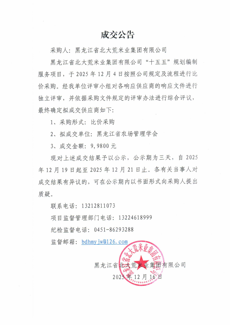 北大荒米業(yè)集團(tuán)“十五五”規(guī)劃編制服務(wù)項(xiàng)目成交公告